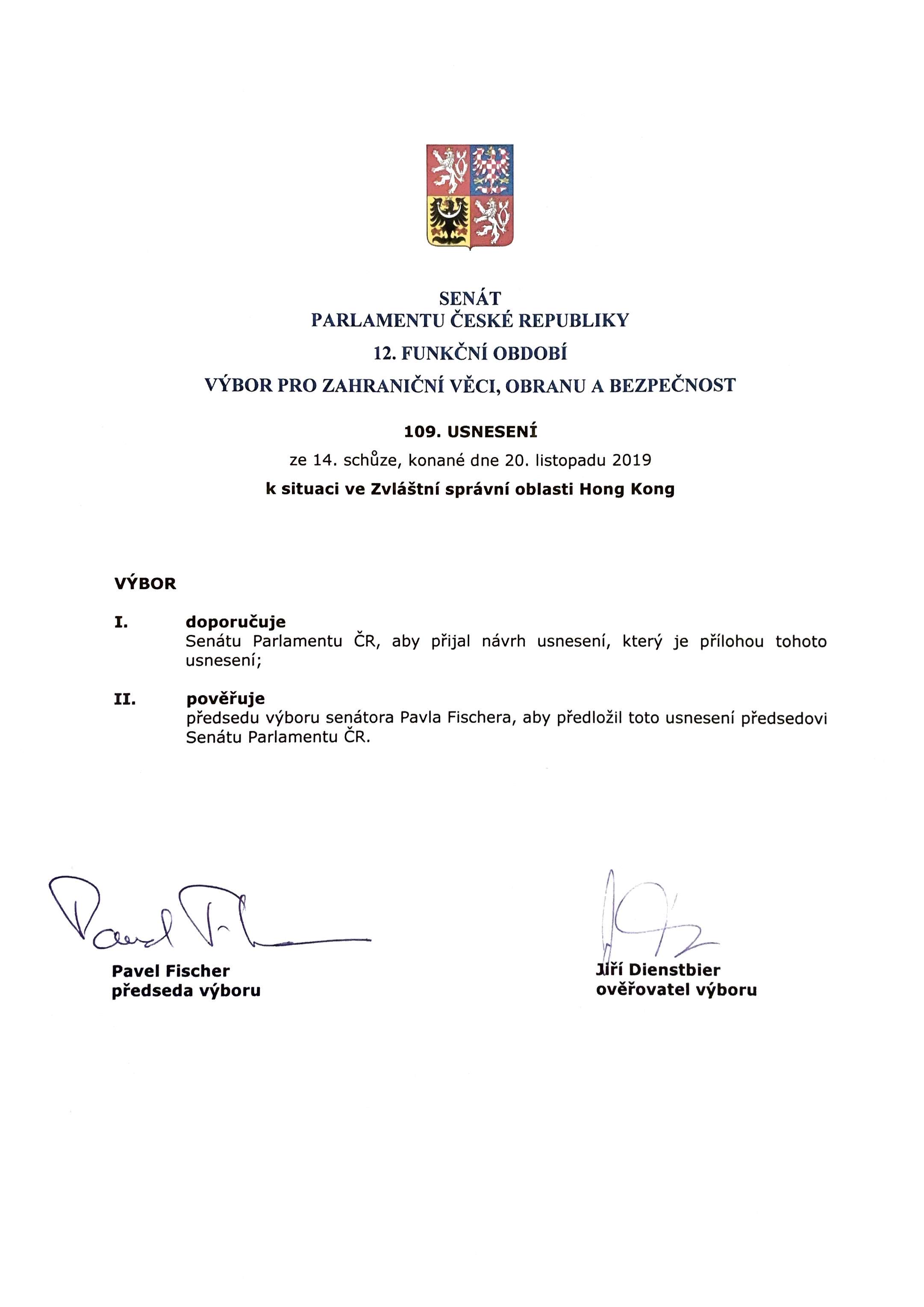 Schůze VZOB 20. listopadu 2019: Usnesení k situaci v Hong Kongu a cestě na Tchaj-wan