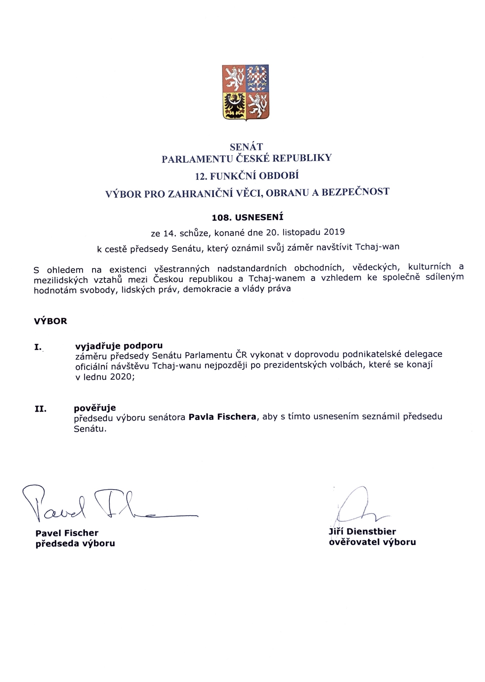 Český Senát odmítl snahy Číny manipulovat s textem rezoluce OSN a vyjádřil podporu smysluplnému zapojení Tchaj-wanu do mezinárodní spolupráce