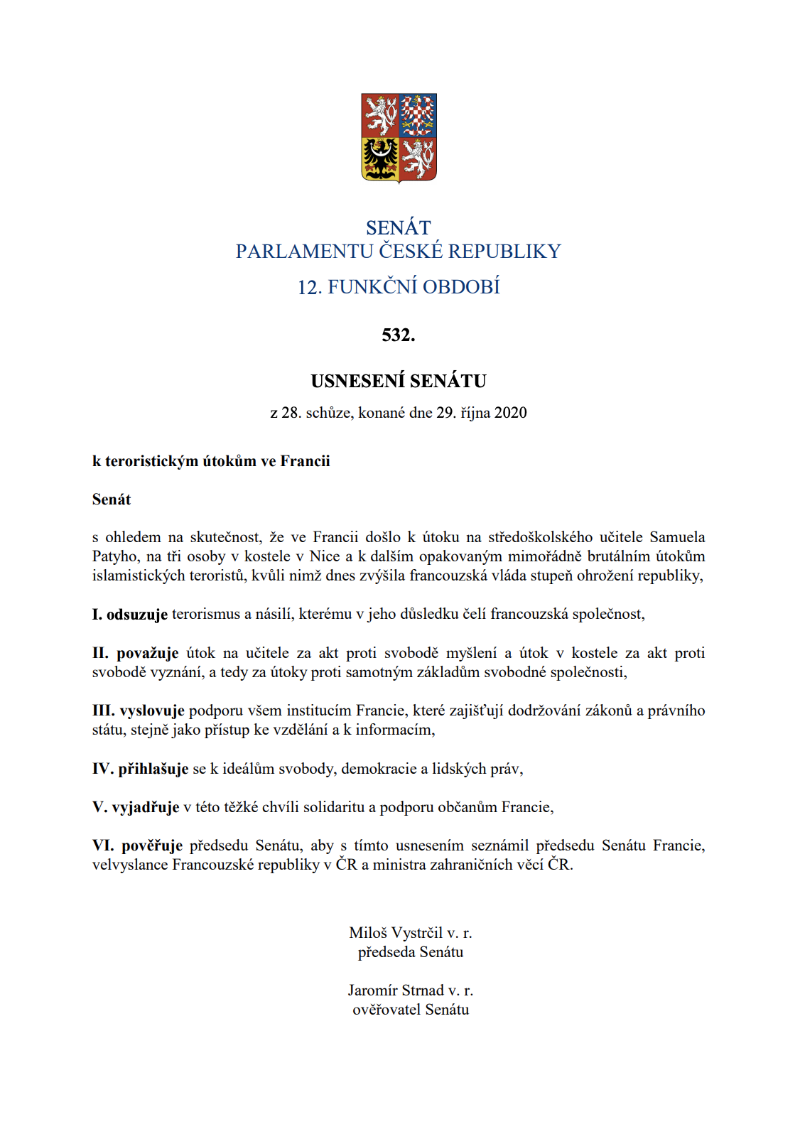 VI. pověřuje předsedu Senátu, aby s tímto usnesením seznámil předsedu Senátu Francie, velvyslance Francouzské republiky v ČR a ministra zahraničních věcí ČR.“