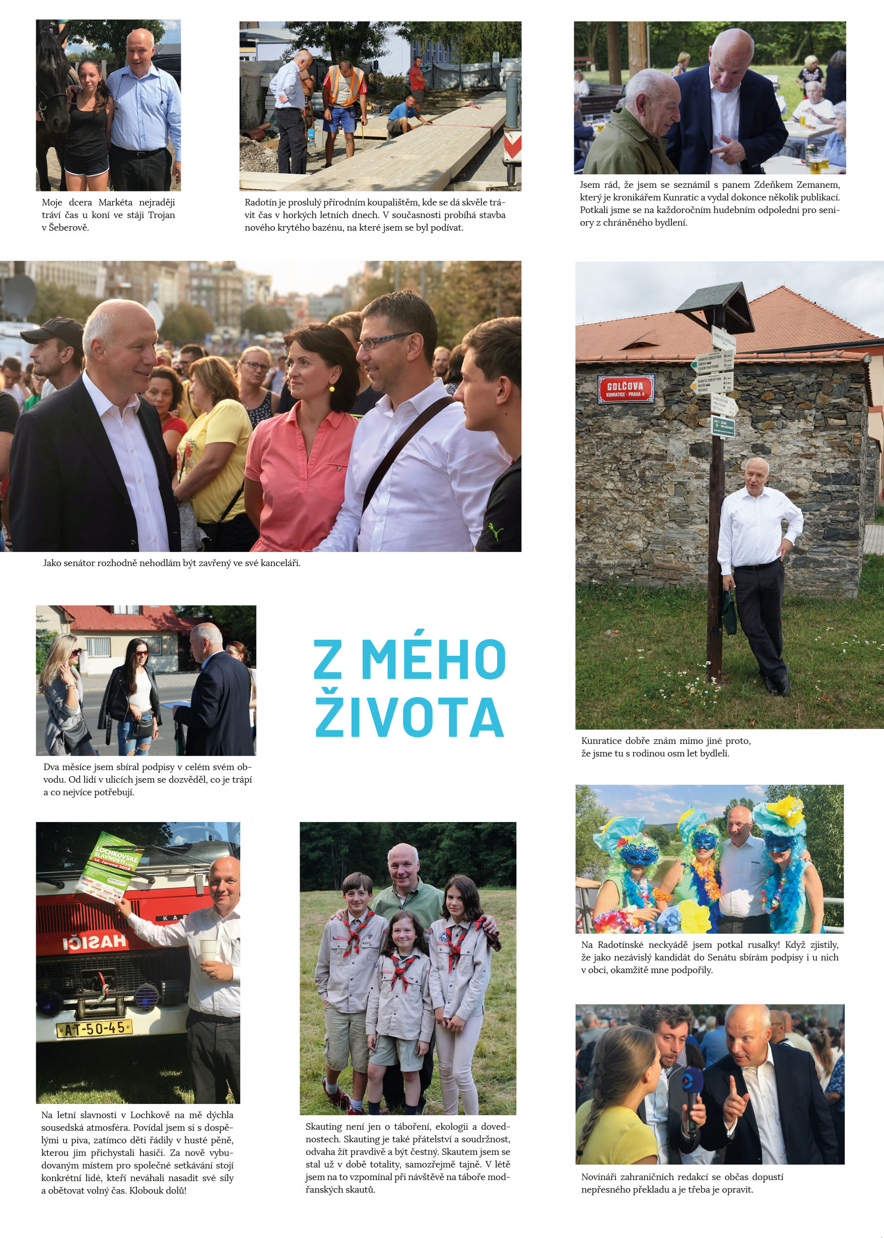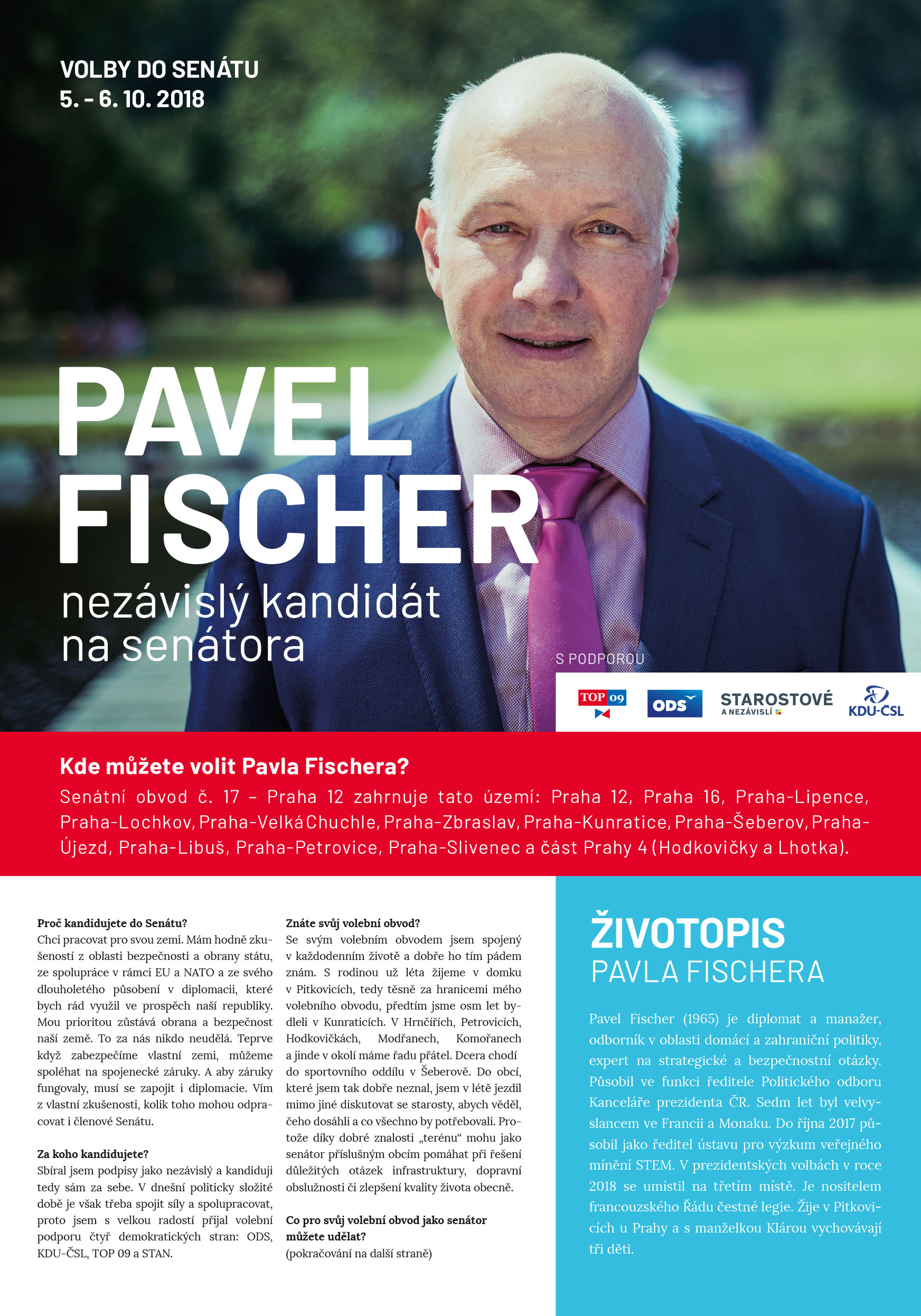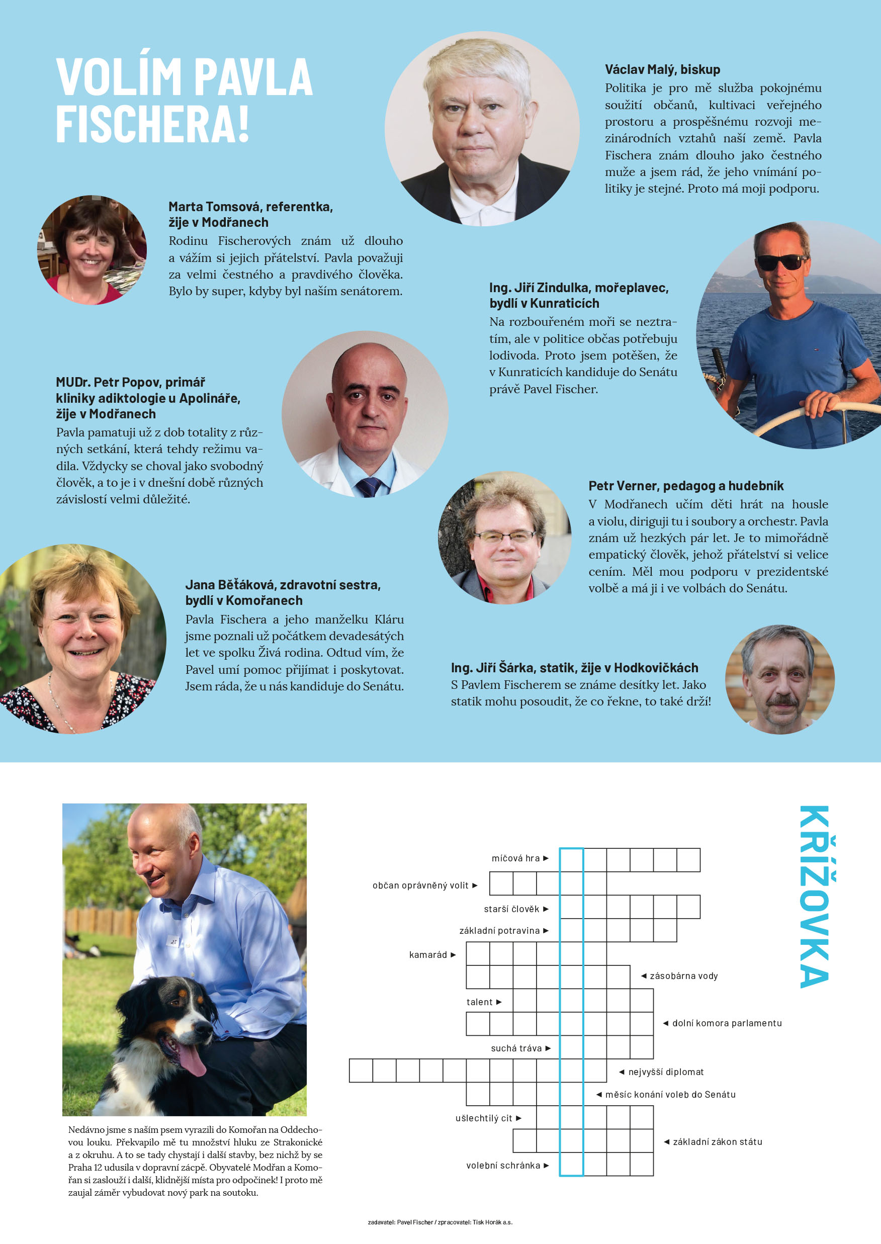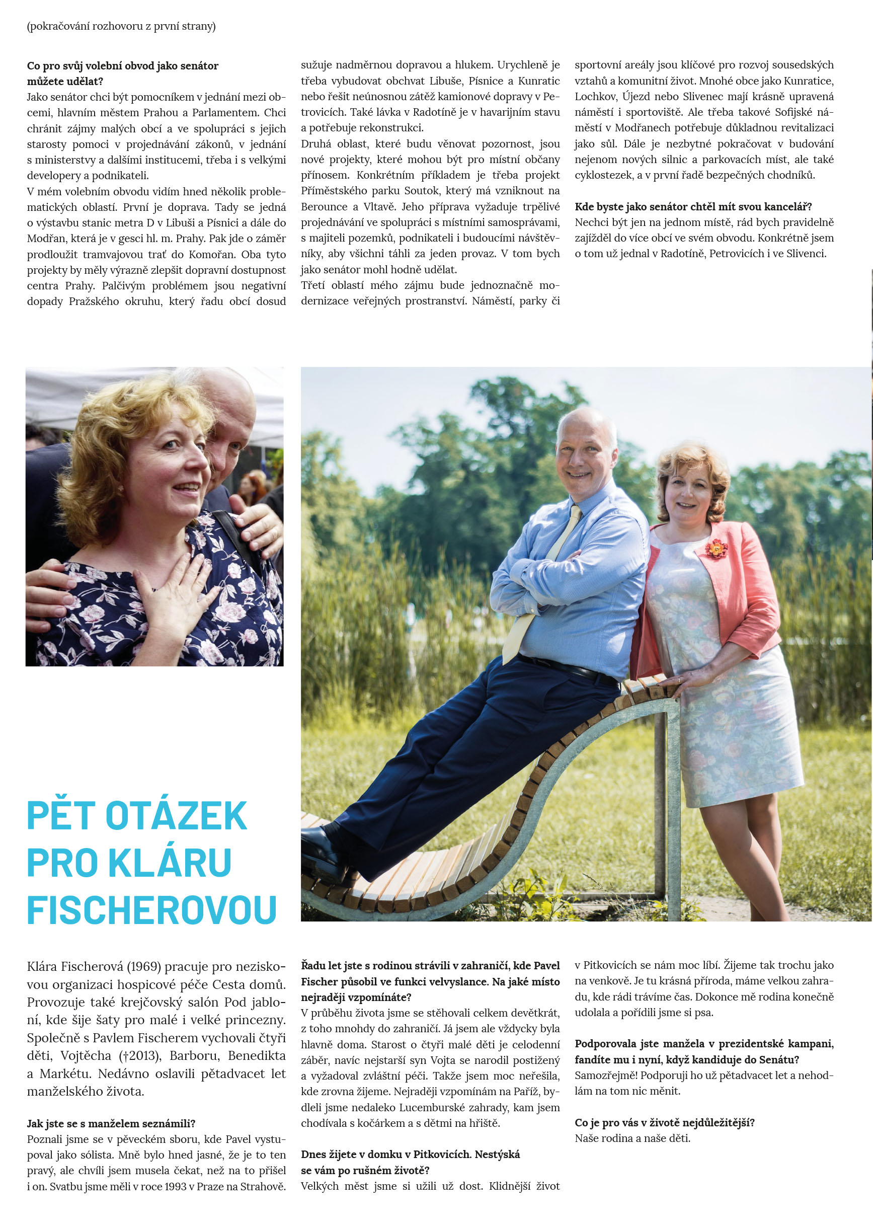 Najdete v nich rozhovor nejenom o volebním programu a práci senátora s Pavlem Fischerem, rozhovor s jeho manželkou Klárou Fischerovou. Na třetí straně naleznete fotografie ze života Pavla Fischera, na čtvrté straně doporučení osobností a křížovku.